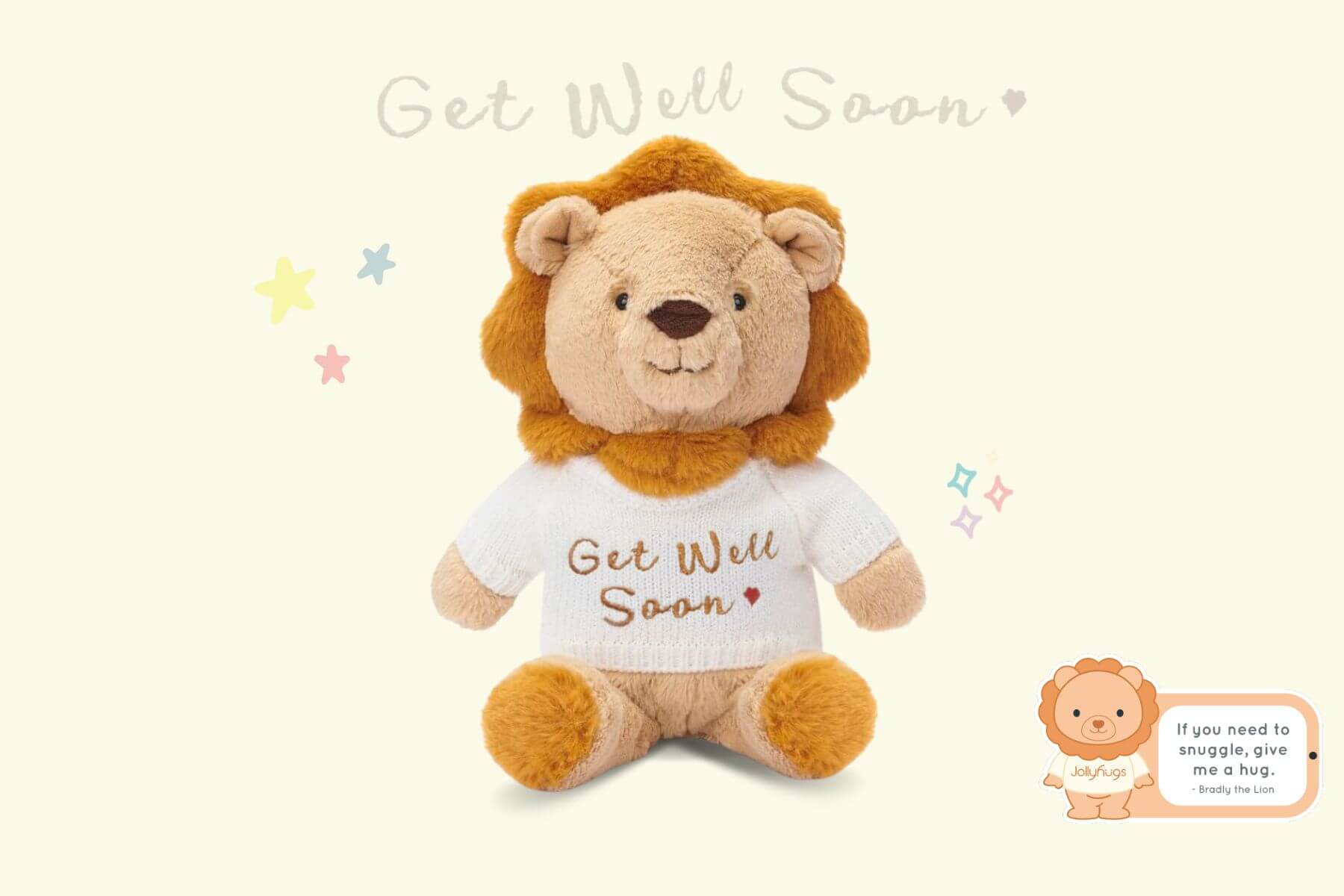 Hugging something cuddly releases serotonin and makes you feel good! Jollyhugs animals are the perfect size to cuddle and love. Let this "Get Well Soon" animal helps them get relaxed.